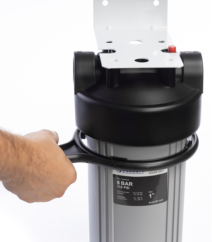 Sistema di filtrazione completo di: contenitore, filtro, chiave e staffa, con cartuccia specifica per la rimozione contaminanti, Pfas e Pfos.