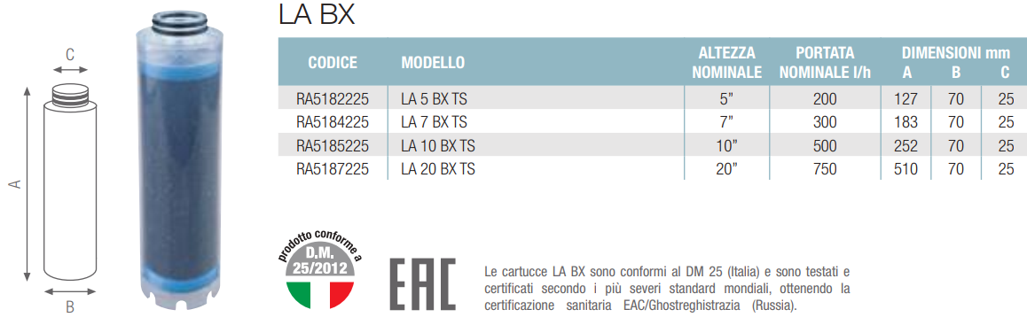 Le cartucce BT RL LA BX e LA BX sono conformi al DM 25 (Italia) e sono testate e certificate secondo i più severi standard mondiali, ottenendo la certificazione sanitaria EAC/Ghostreghistrazia (Russia) e WaterMark (Australia).